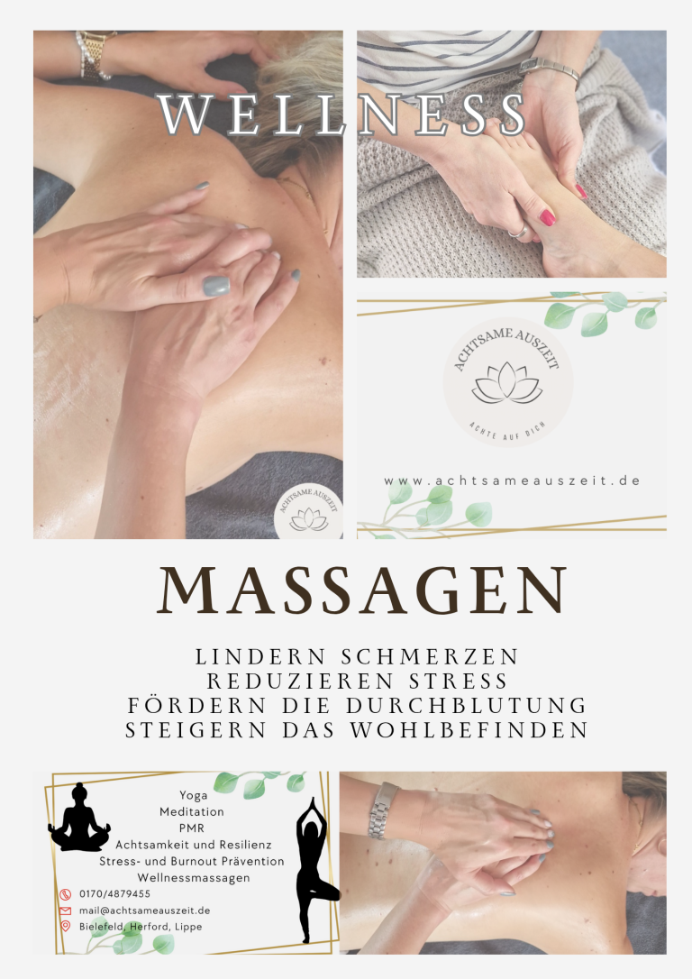 Zu einer echten Auszeit gehört natürlich Entspannung pur. Als Fachpraktikerin für Massage, Wellness und Prävention biete ich auch Wellnessmassagen an. Meine Massageliege und ich kommen zu dir nach Hause, so kannst du im Anschluss selbst entscheiden, ob du noch liegen bleiben und weiter relaxen willst oder direkt aufstehen und mit neuer Energie durchstarten möchtest.